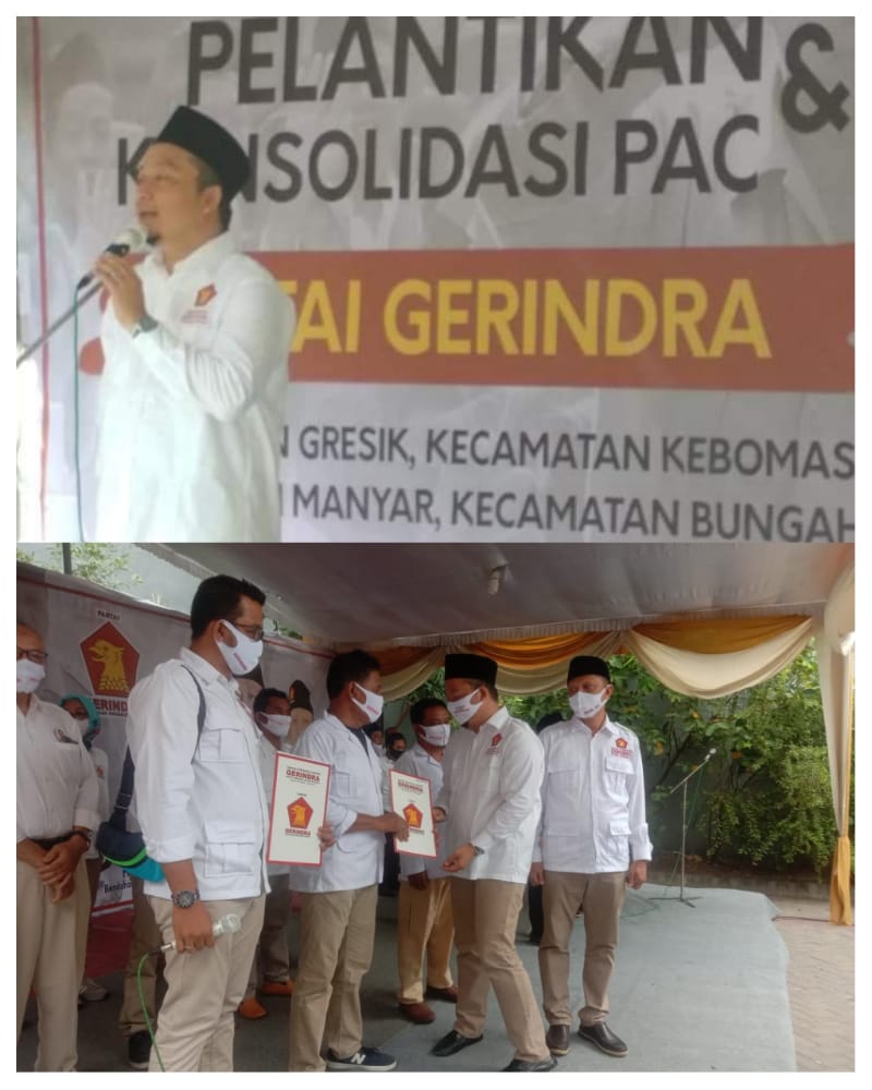 Gresik, suara-publik.com Ketua DPC Partai Gerindra Kabupaten Gresik,Asluchul Alif mengukuhkan empat pengurus PAC (Pimpinan Anak Cabang) tahap I di Posko Pemenangan Pasangan Qosim-Alif (QA) Jalan Kalimantan Gresik Kota Baru (GKB), Kecamatan Manyar, Sabtu (15/8/2020).