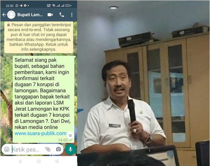 LAMONGAN, Suara Publik-Tudingan Lembaga Swadaya Masyarakat (LSM) Jaringan Inspirasi & Emansipasi Masyarakat (JERAT) atas keterlibatan Bupati Lamongan, H. Fadeli., SH., MM terhadap sejumlah dugaan tindak pidana Korupsi di Kabupaten Lamongan, di jawab singkat Kepala Dinas Komunikasi dan Informatika (Kadis Kominfo) Pemerintah Kabupaten (Pemkab) Lamongan, Achmad Edwyan Anedi ., S.sos., MM via Whatsapp (Rabu, 25/11/2020). “Maaf saya tidak dugaan korupsi yang dimaksud itu. Sehingga mohon maaf tidak bisa memberikan komentar,” ucap Edwyan via Whatsapp kepada www.suara-publik.com.