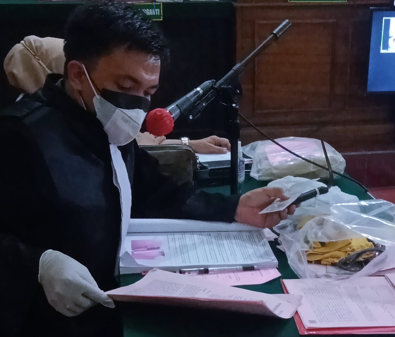 Jaksa Sulfikar, menunjukan bukti CCTV dan pisau, kaos yang dipakai terdakwa, dimeja majelis hakim, yang disaksikan oleh saksi Ria dan Penasihat Hukum terdakwa Eren.