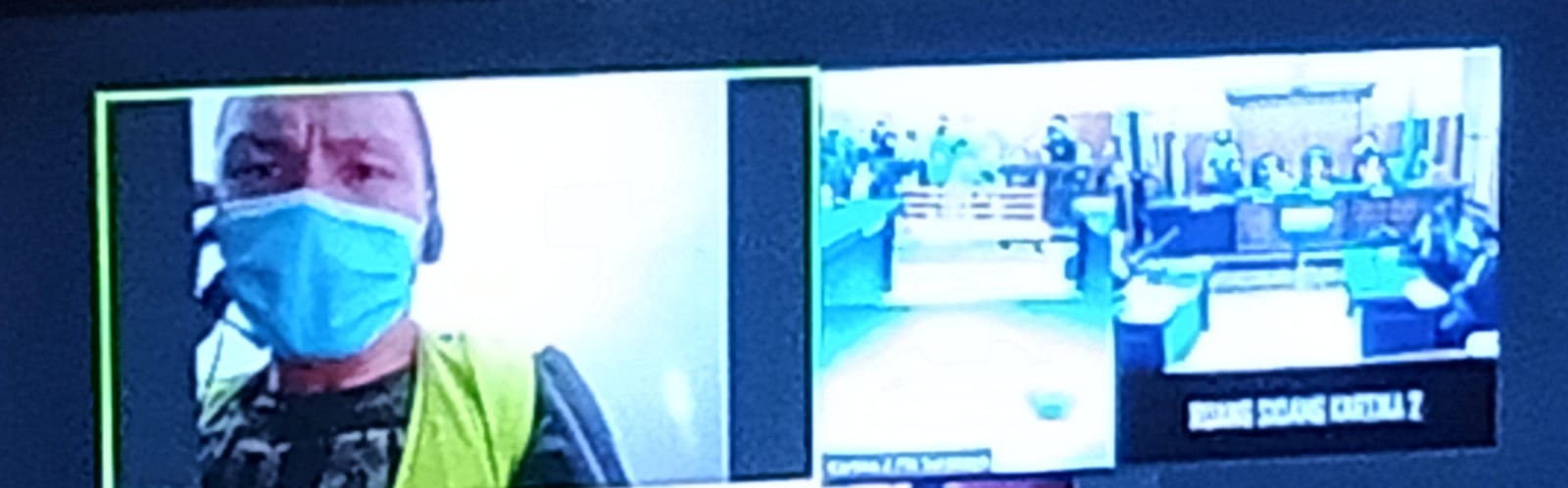 Foto atas: Terdakwa Eren bin Alai, menjalani sidang diruang Kartika PN.Surabaya, secara online Rabu (01/09/2021). Foto bawah: Jaksa Sulfikar, menunjukan barang bukti pisau yang dibuat membunuh dan kaos yang dipakai terdakwa dan sepatu.