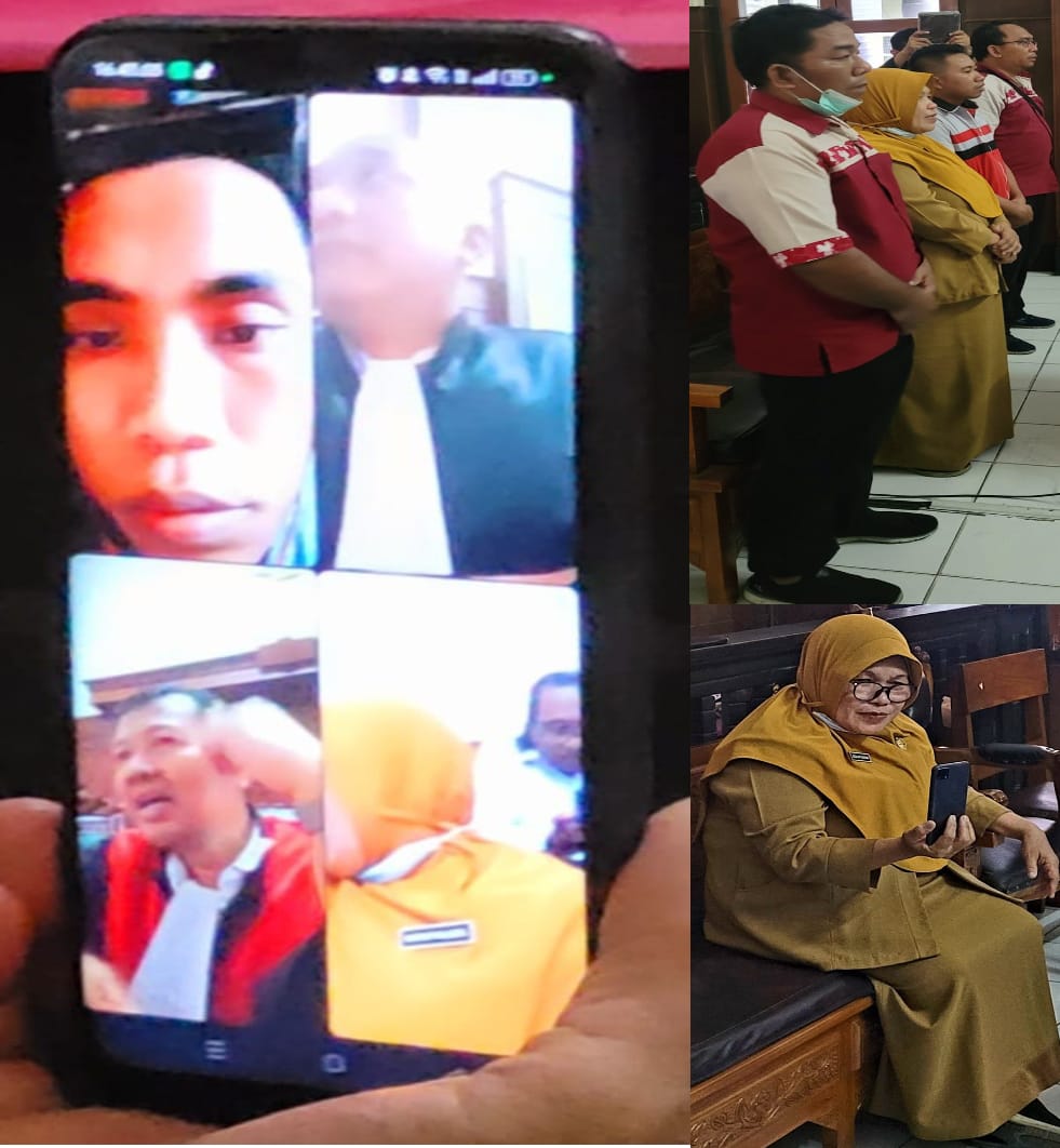 Foto : Terdakwa Zainal Abidin jalani sidang di uang Tirta 1 PN. Surabaya, secara vidio Call, 4 orang saksi, diperiksa satu saksi terlebih dahulu, tiga saksi diperiksa pada sidang berikutnya dan saksi Zalzilah Rahmah sebagai Kepala Instalasi RS. Seowandie,