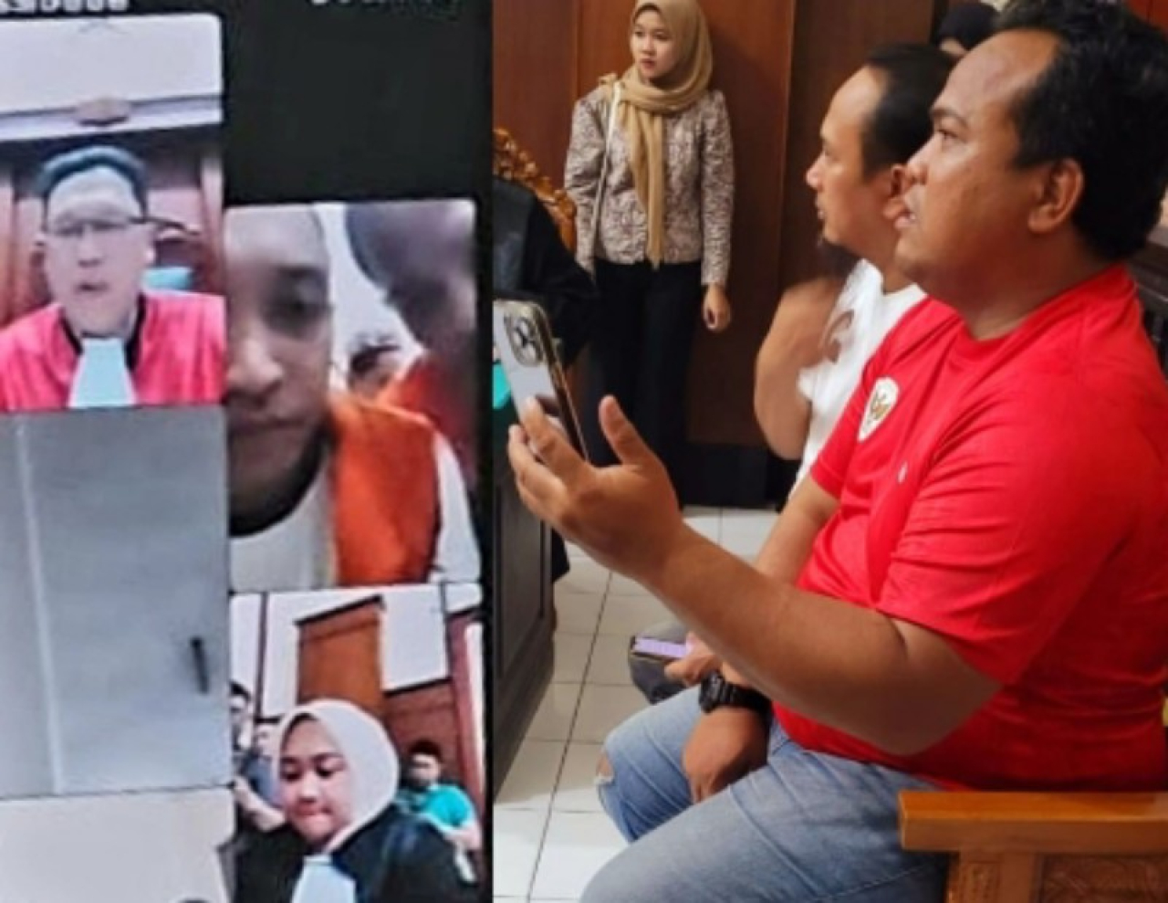 Foto: Terdakwa Joko Harianto dan Rachmad Aris (kiri), dua saksi polisi Djunaidi dan Budi Ariawan (kanan), agenda sidang tuntutan JPU di PN Surabaya secara vidio call