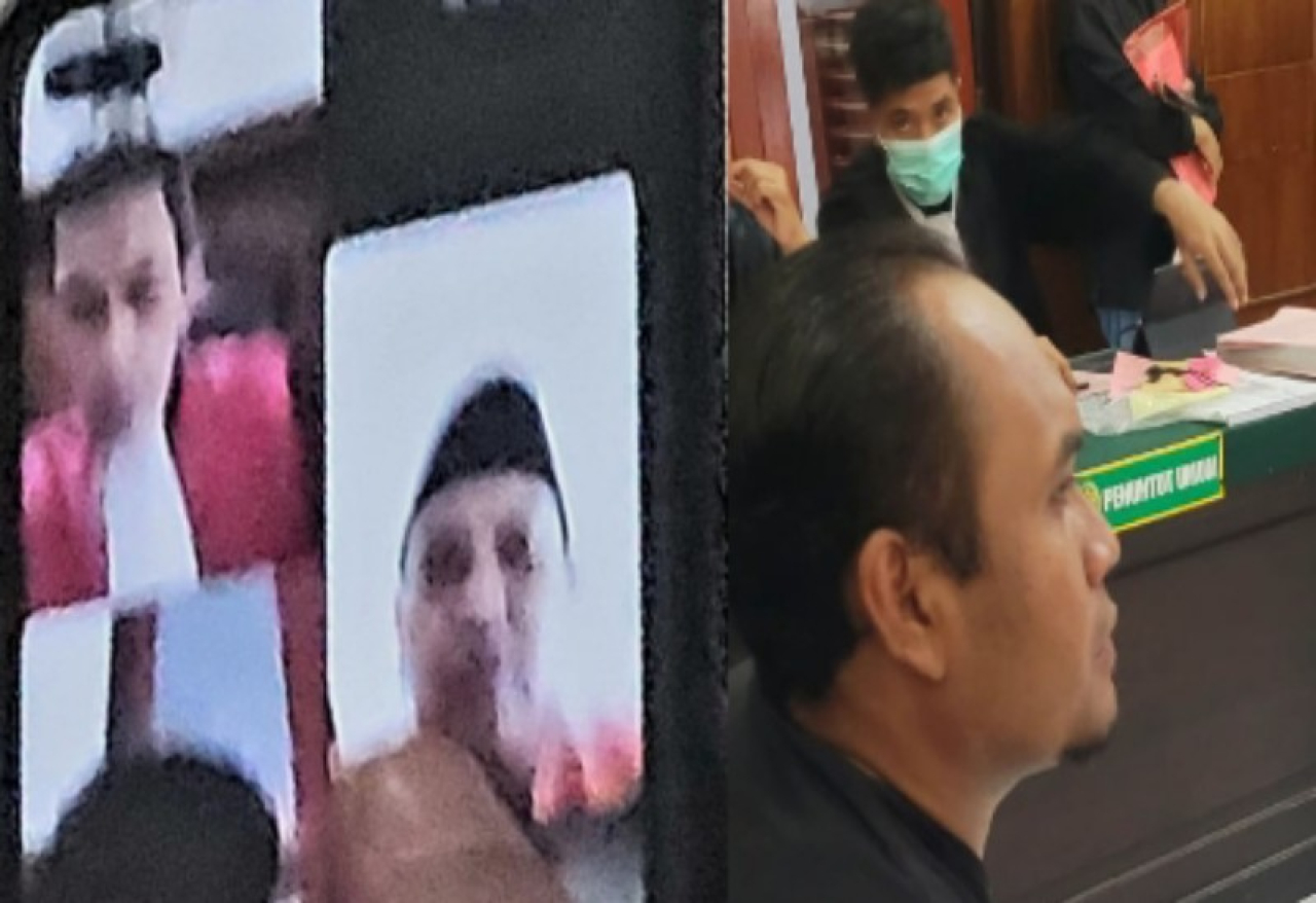 Terdakwa Saiful Bahri bin Buna'i (41 th), (tengah dan saksi penangkap (kanan), agenda sidang putusan hakim di PN Surabaya secara vidio call