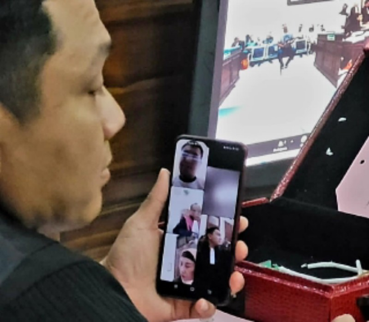 Foto: Sidang Narkotika jenis pil ekstacy dan sabu, dengan terdakwa Gerald Hariyanto (dalam layar HP), JPU Deddy Arisandi membacakan tuntutan di PN Surabaya secara vidio call