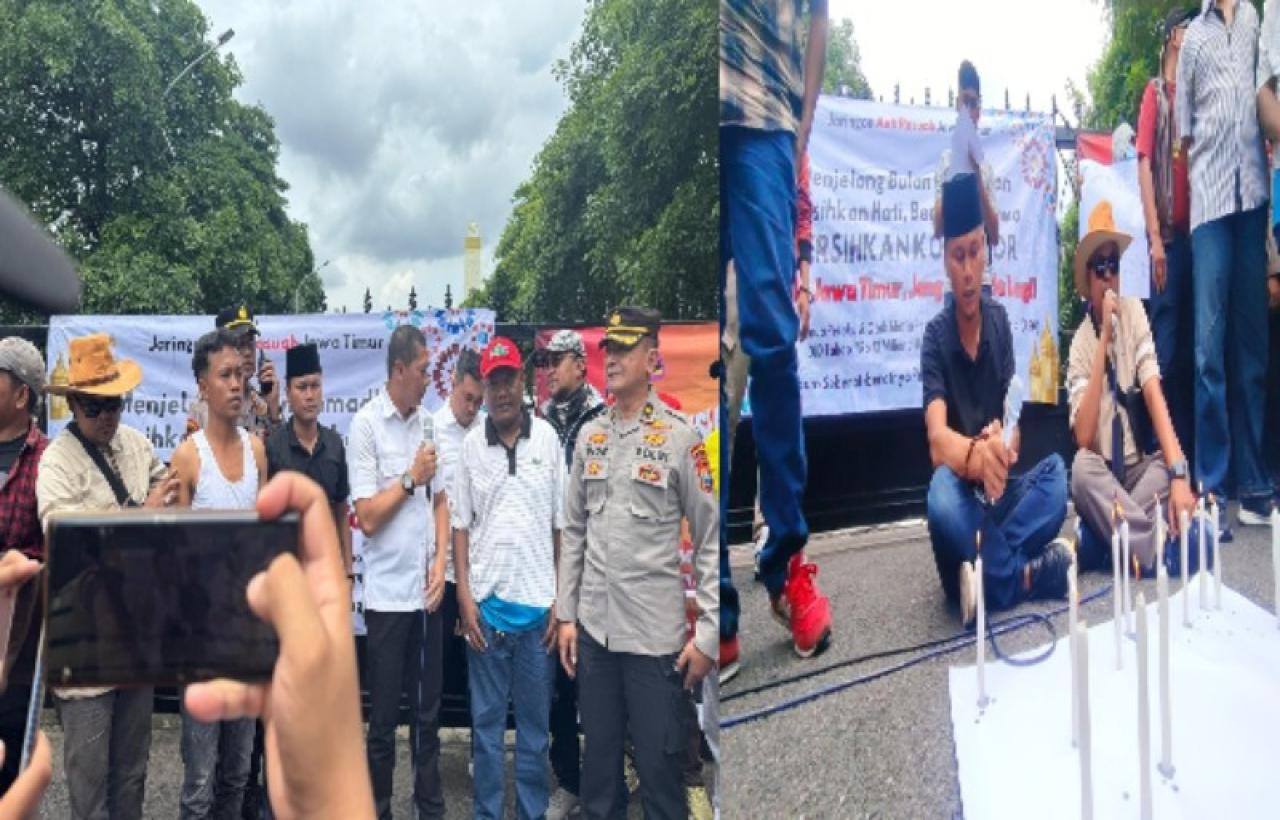 Massa demontrasi menyalakan lilin dan doa tahlil bersama sebagai simbol menerangi Polda Jatim untuk mengungkap kasus korupsi dan juga sebagai bentuk seruan moral kepada penyidik agar segera menindaklanjuti laporan dan menangkap semua pihak yang terlibat dalam orasinya.