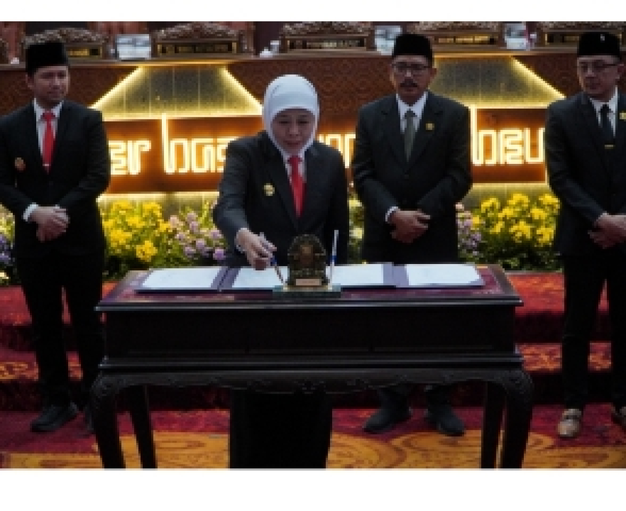 ‎Gubernur Jatim, Khofifah Indar Parawansa, yang didampingi Wagub Emil Elestianto Dardak bersama Ketua DPRD Prov. Jatim M. Musyafak Rouf menandatangani Nota Persetujuan Bersama KUA PPAS atas P-APBD Jatim Tahun Anggaran 2025 dalam Sidang Paripurna yang digelar di Gedung DPRD Jatim, Senin (11/8/2025).