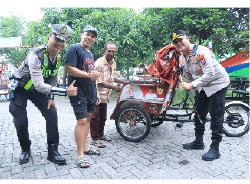 Aksi Humanis Operasi Keselamatan Semeru, Kapolres Gresik Bagikan Helm Gratis Pengemudi Becak Listrik