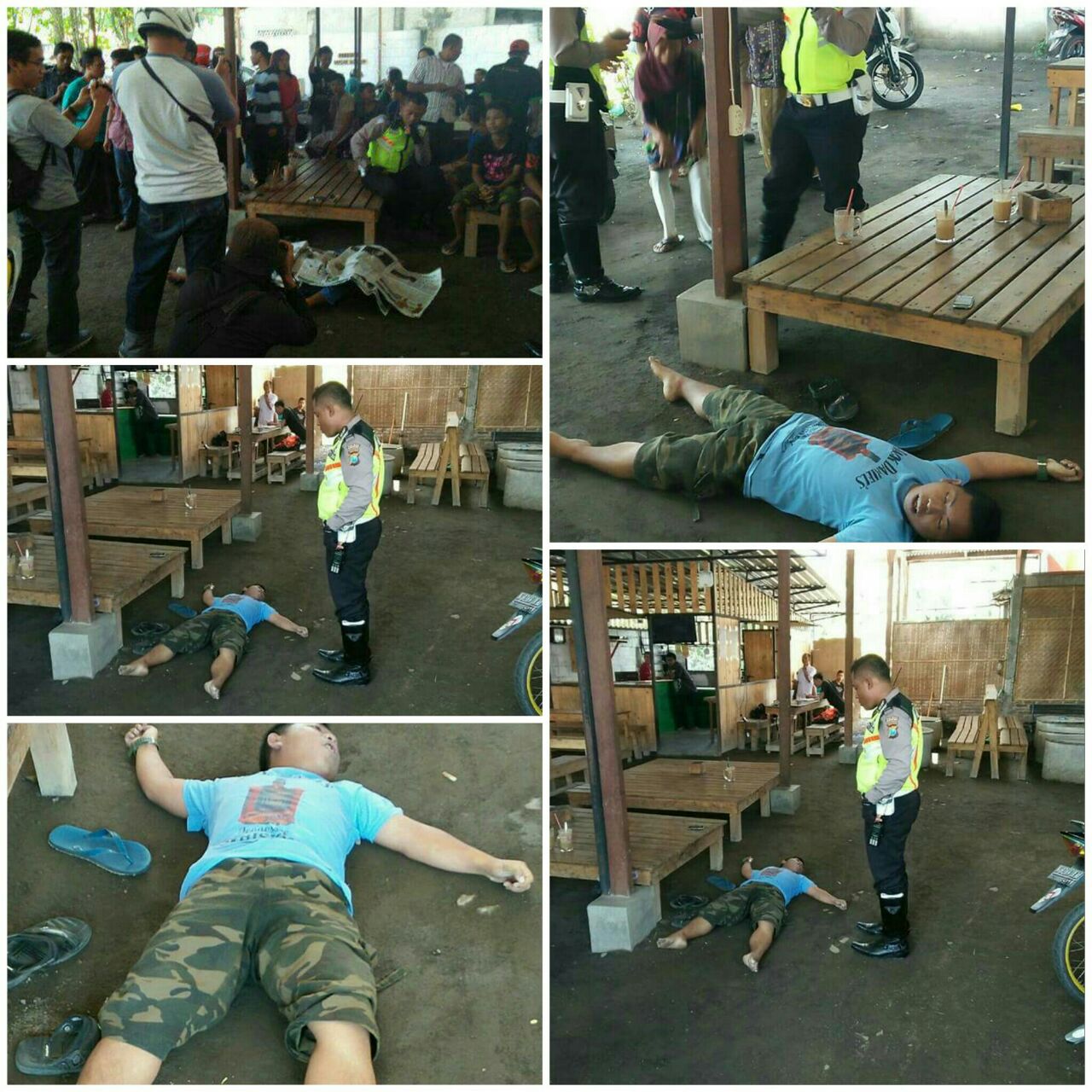 Berdasarkan keterangan Eki, saksi mata yang baru datang jam 10.00 wib, posisi korban sudah datang terlebih dahulu dan telah menghabiskan minuman segelas Es Good Day. Dengan posisi masih duduk tiba-tiba korban terjatuh dari tempat duduk ke tanah dan mengalami kejang-kejang lalu korban terlihat diam dan melaporkan hal tersebut Pos Polantas Kebonagung.