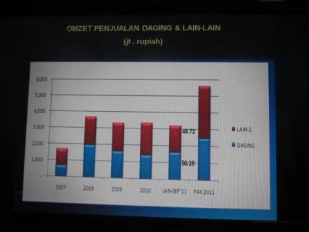 Sementara, lanjut Nur, omset per-bulan pada 2011, dari Abon sebesar Rp. 30.000.000,-, Daging Rp. 330.000.000,-, Rumen Rp. 15.000.000,-, Bakso Rp. 187.000.000,-, Burger Rp. 59.000.000,- dan produk baru membuat Dendeng sebesar Rp. 5.000.000,-, serta penjualan Sapi pada 2011 dengan omset Rp. 425.000.000,-. “Total sebesar Rp. 626.000.000,-, dengan masukan sekitar Rp. 50.000.000,” sambung Nur.