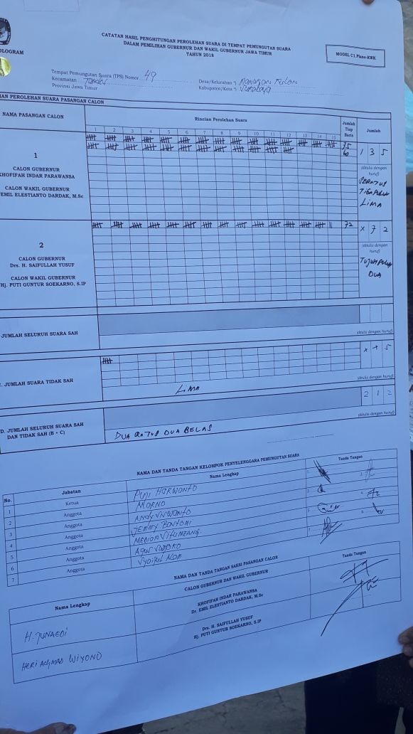 Dari 381 DPT (daftar pemilih tetap) yang ada, tercatat hanya sebanyak 212 orang saya menggunakan hak pilihnya. Dengan rincian, 135 suara untuk paslon Khofifah-Emil dan 72 suara untuk paslon Gus Ipul-Puti. Sedangkan suara yang dinyatakan tidak sah sebanyak 5 suara.
