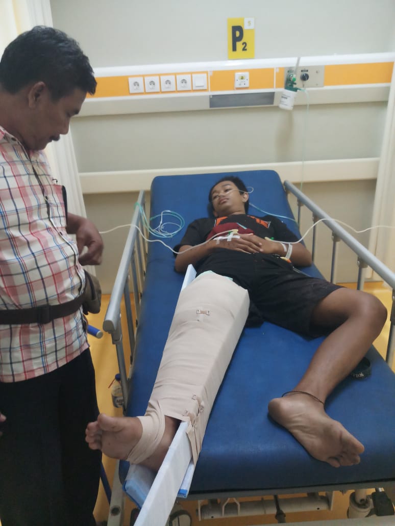 Kemudian pelaku yang di belakang melempar korban dengan bondet dan mengenai kaki kanan korban.
