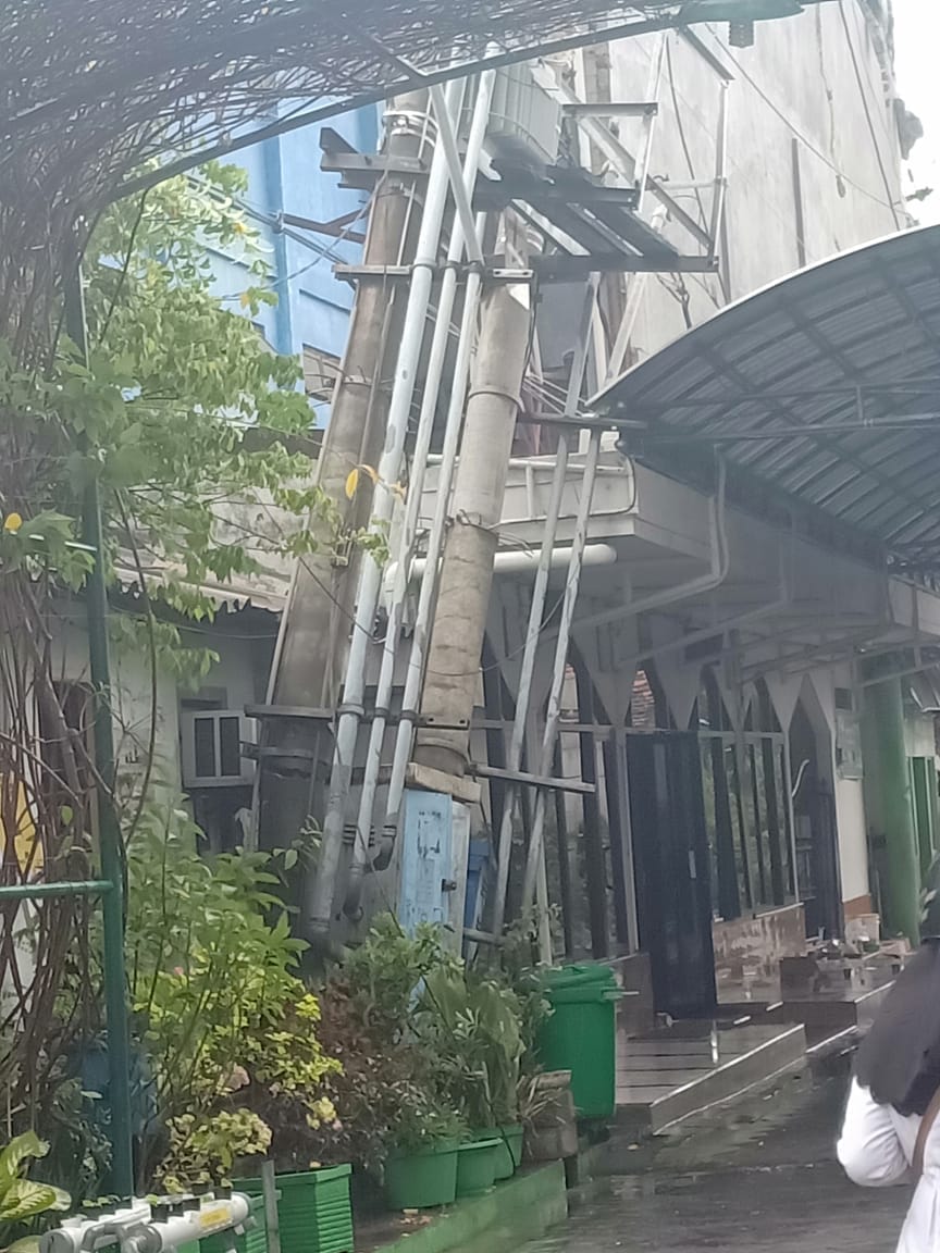 Foto atas: Suasana korban di beri pertolongan pertama. Bawah: Tiang listrik yang miring akibat dinding GOR yang roboh.