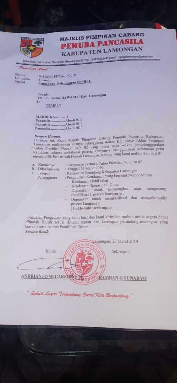 LAMONGAN, Suara Publik - Majelis Pimpinan Cabang (MPC) Pemuda Pancasila (PP) Kabupaten Lamongan melaporkan dugaan pelanggaran kampanye yang dilakukan oleh pendukung capres 02 Prabowo Subianto ke pihak Badan Pengawas Pemilu (Bawaslu) Kabupaten Lamongan, Rabu (27/3).
