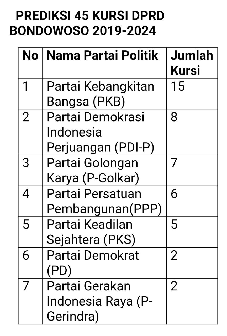 Prediksi Perolehan Kursi DPRD Bondowoso 2019-2024, PKB Terbanyak Nasdem dan Pan Kehilangan Kursi.